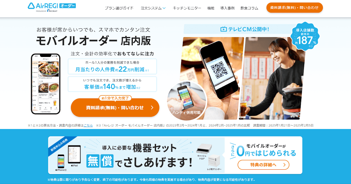 AieREGIでは期間限定で「Airレジ オーダー モバイルオーダー 店内版+キッチンモニター」の新規申込みで、導入に必要な機器セット最大59万円分が無償でもらえます。 詳しくはこちら
